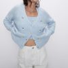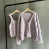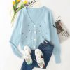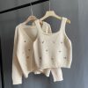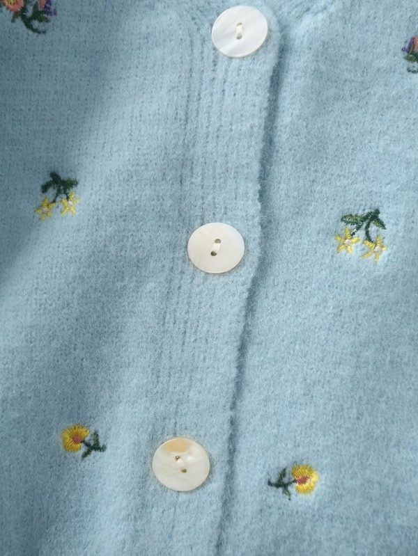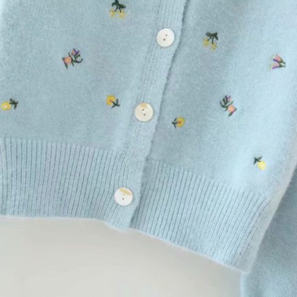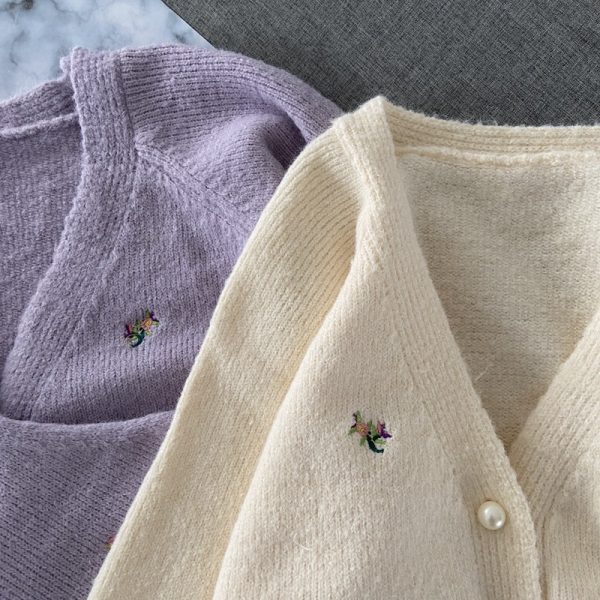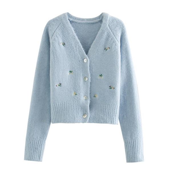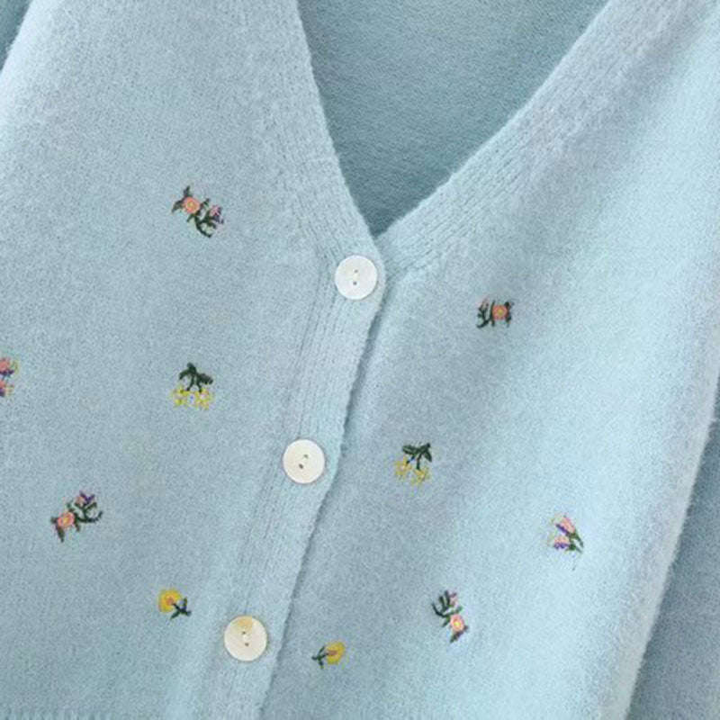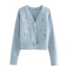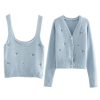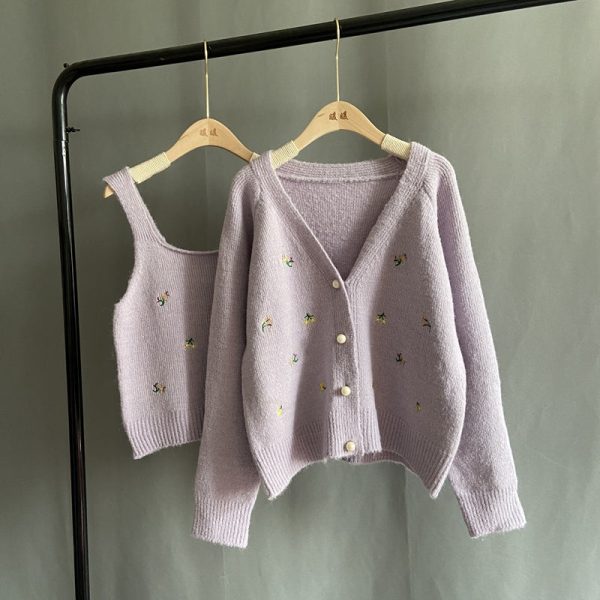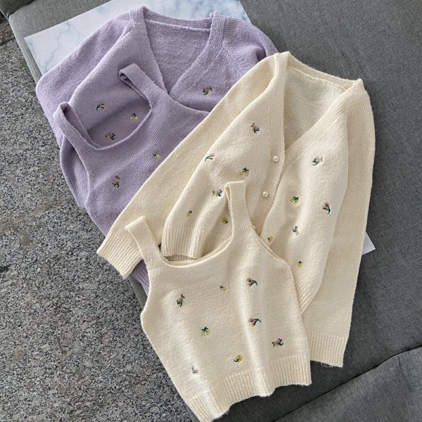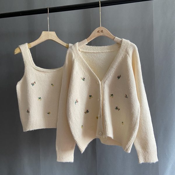 Design: Flower Emboidery, V Neck, Button Down, Loose, Oversized, Long Sleeves, Knitted Tank Crop Top, Two piece Set & Casual.