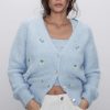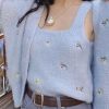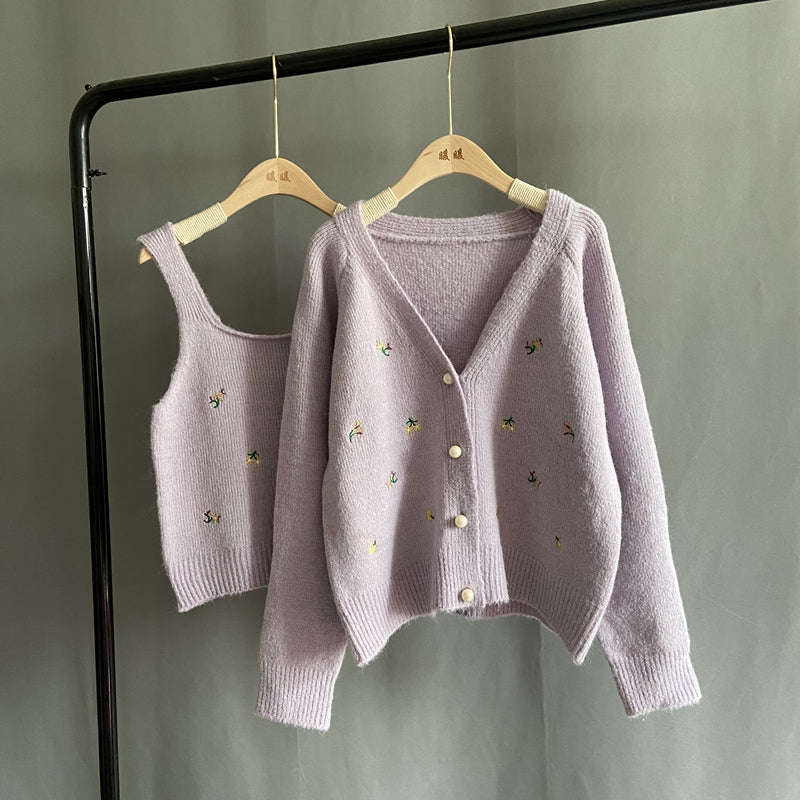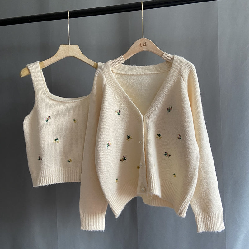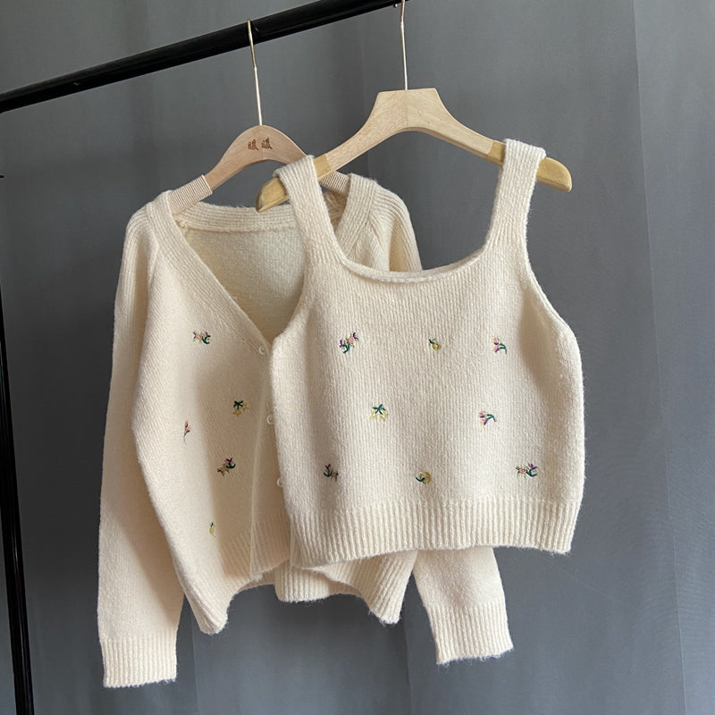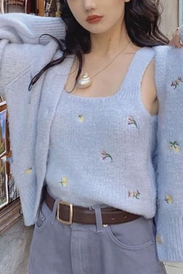 This embroidered knitted cardigan sweater set comes in a soft, contrast floral embroidery, v neckline, button up, wide strap crop top tank top two piece set and long sleeves short cardigans. The oversized embroidered sweater cardigan is popular with cami, tank, pants, denim, jeans, leggings, scarves or dresses, and get wrapped up & cozy feel with any layers underneadh.